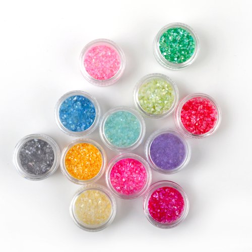 12 Colors boxed crushed shell chips nail art tip decoration is a perfect addition to your make-up, suitable for your party or fashionable look.It includes 10 sparkly colours of crushed shell for nail art designs or other decoration.